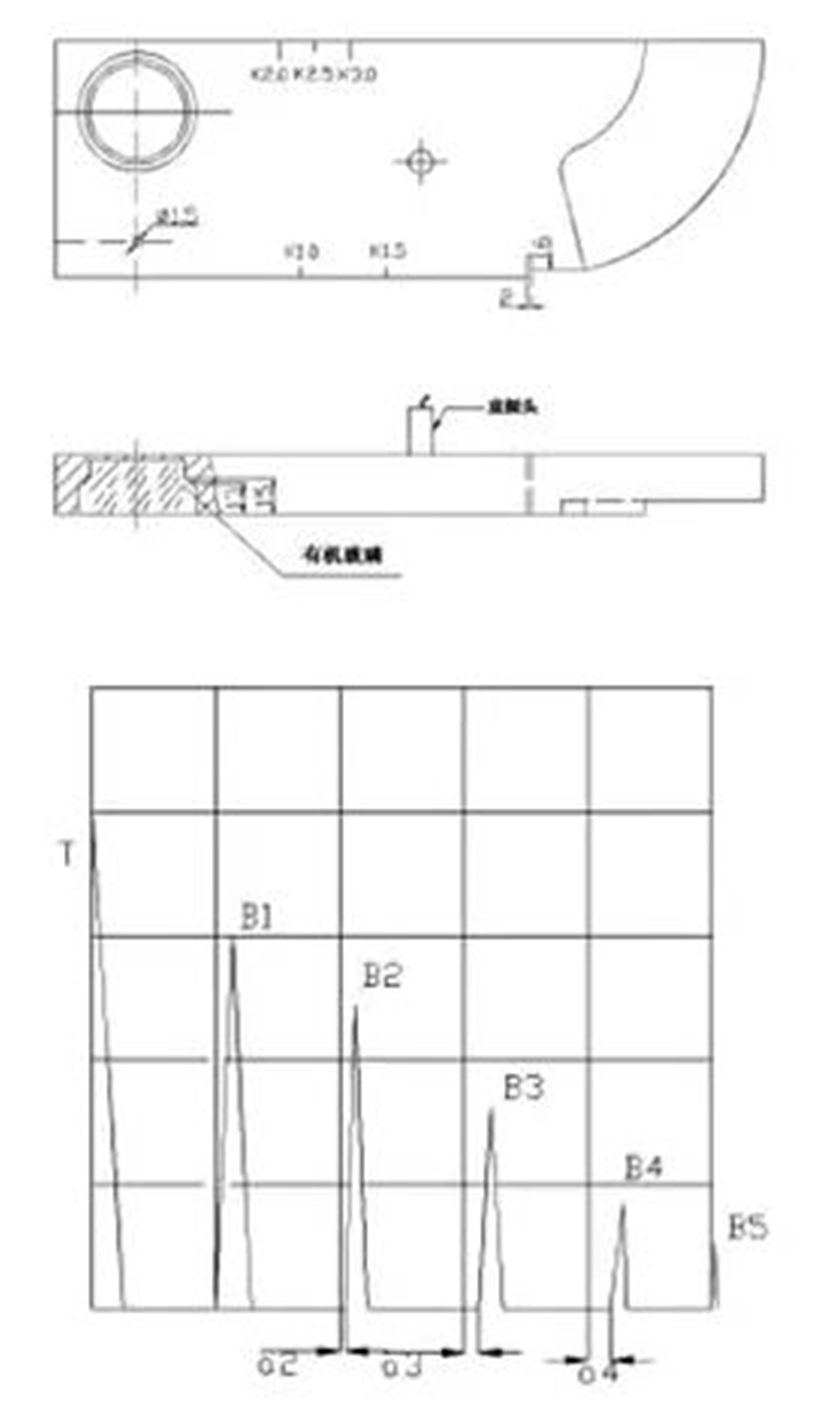 將探傷儀的抑制和補(bǔ)償旋鈕置于“0”或“關(guān)”用直探頭放置在圖中A或B位置。并保證探頭與試塊之間有良好的聲耦合。