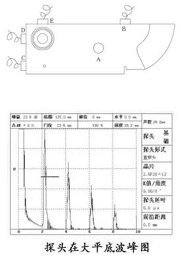 盲區(qū)是指最小的探測距離,測試方法是:將直探頭置于探頭位置圖中D、E位置,測量50mm圓孔反射波。從而可以估計(jì)出盲區(qū)小于等于5mm或大于等于10mm,或者介于兩者之間。
